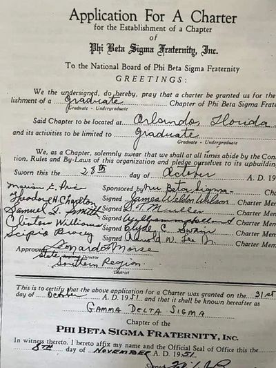 One of our Honorable Founders Brother Leonard F. Morse was the founder of our Graduate Chapter here in Orlando. Morse was the President of Edward Waters College. In the fall of 1951 Founder Morse who then resided in Jacksonville, Florida oversaw the initiation of nine charter members. Those individuals were Stanley Muller, Marion Price, Preston Lamb, William McKinney, W.M. Holland, Samuel Smith, Theodore Charlton, Willie J. Brown and James Wilson. Bro. Wilson is the only surviving charter member. These original members were responsible for laying the foundation of a chapter that has made major contributions to the central Florida community.